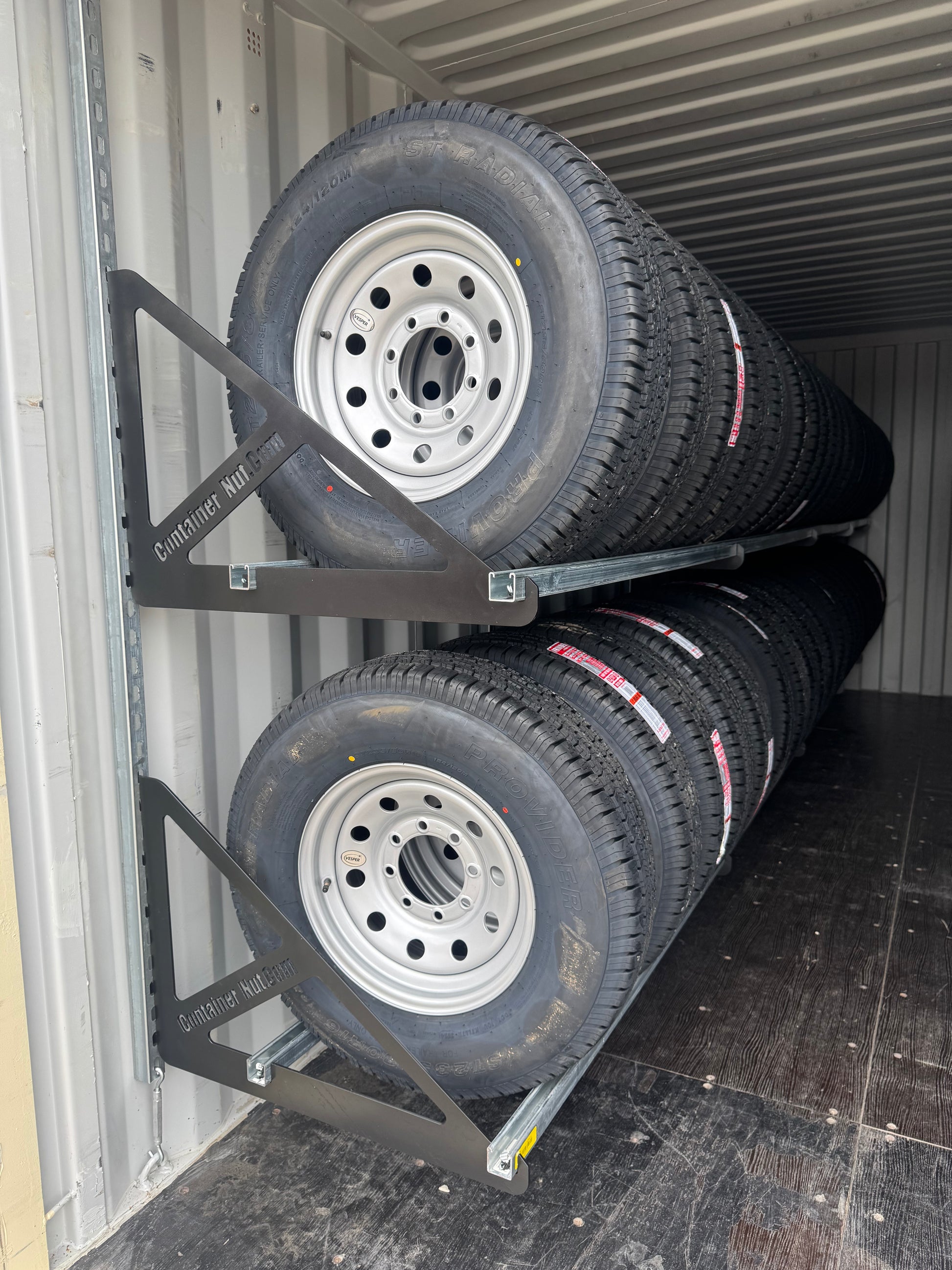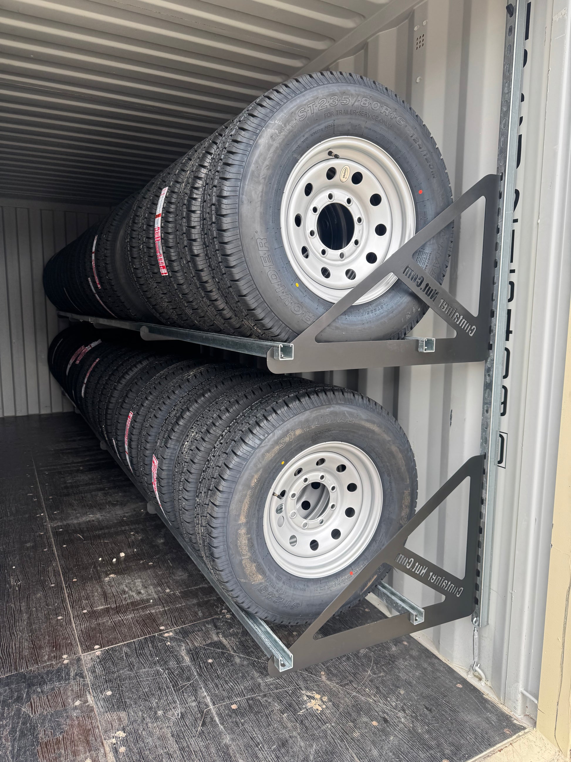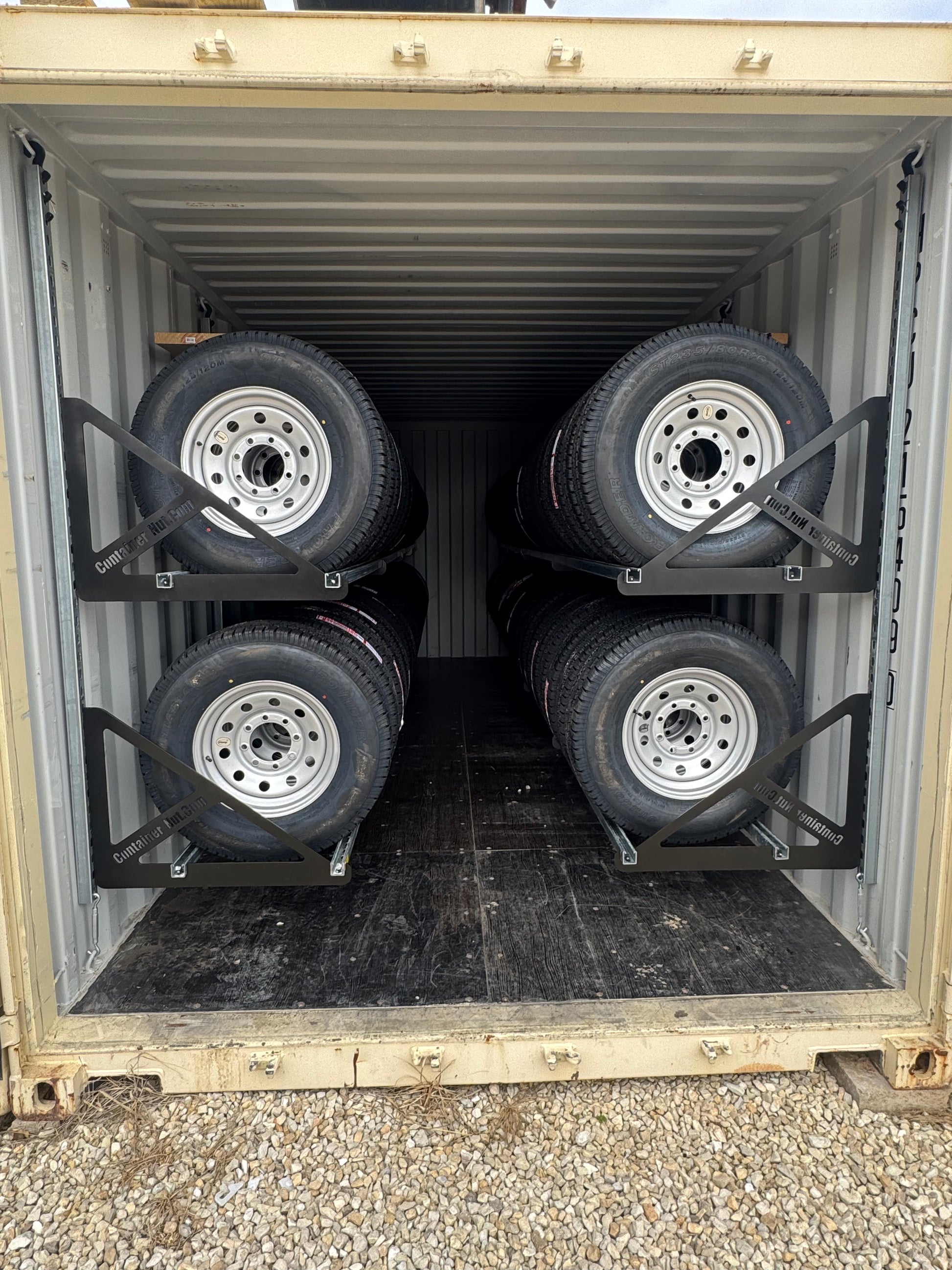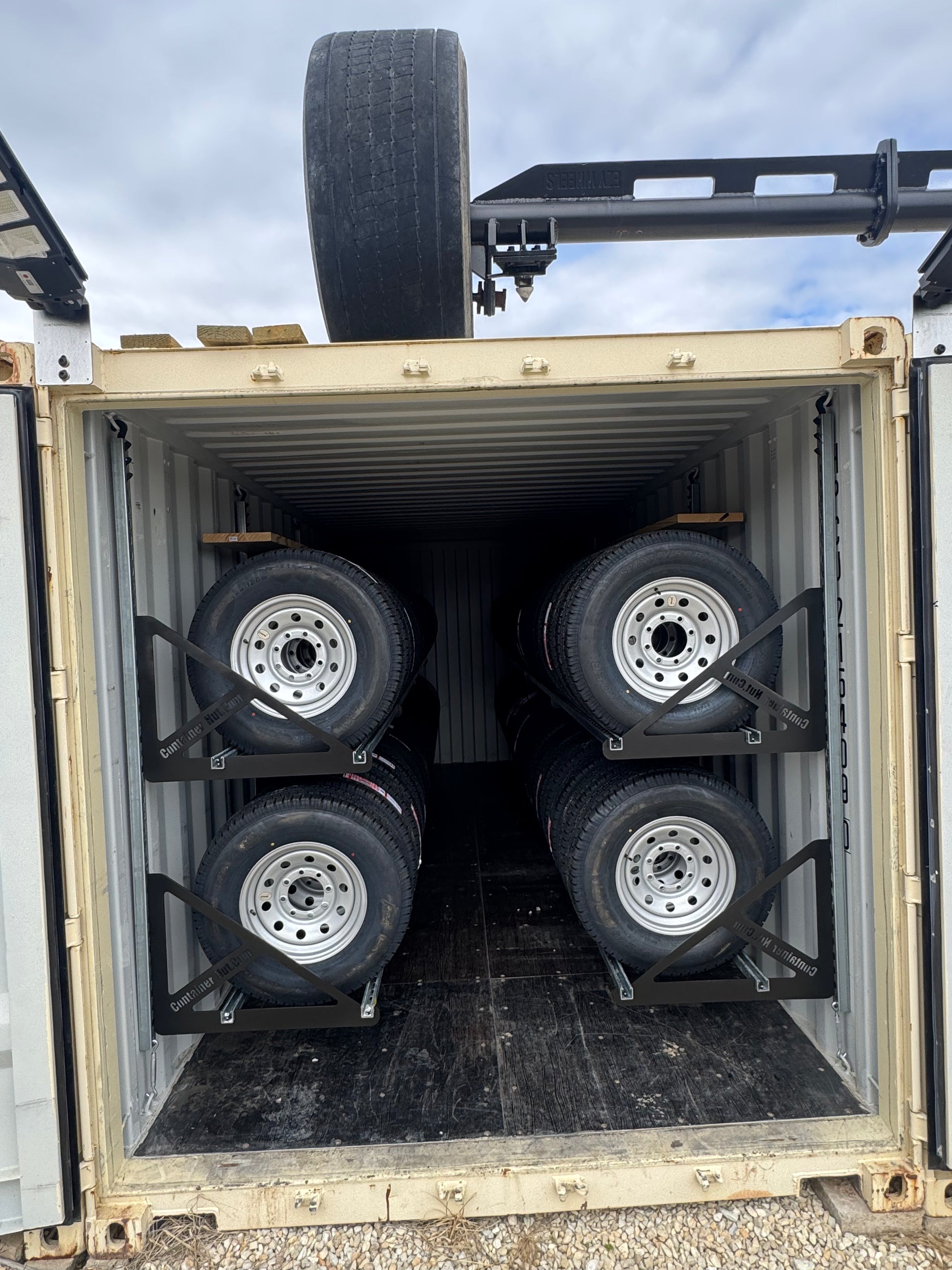 With this system, you can set up an entire 20-foot shipping container in approximately one hour. When installed as shown in the product images, a 20-foot container can securely hold up to 80 tires or more.