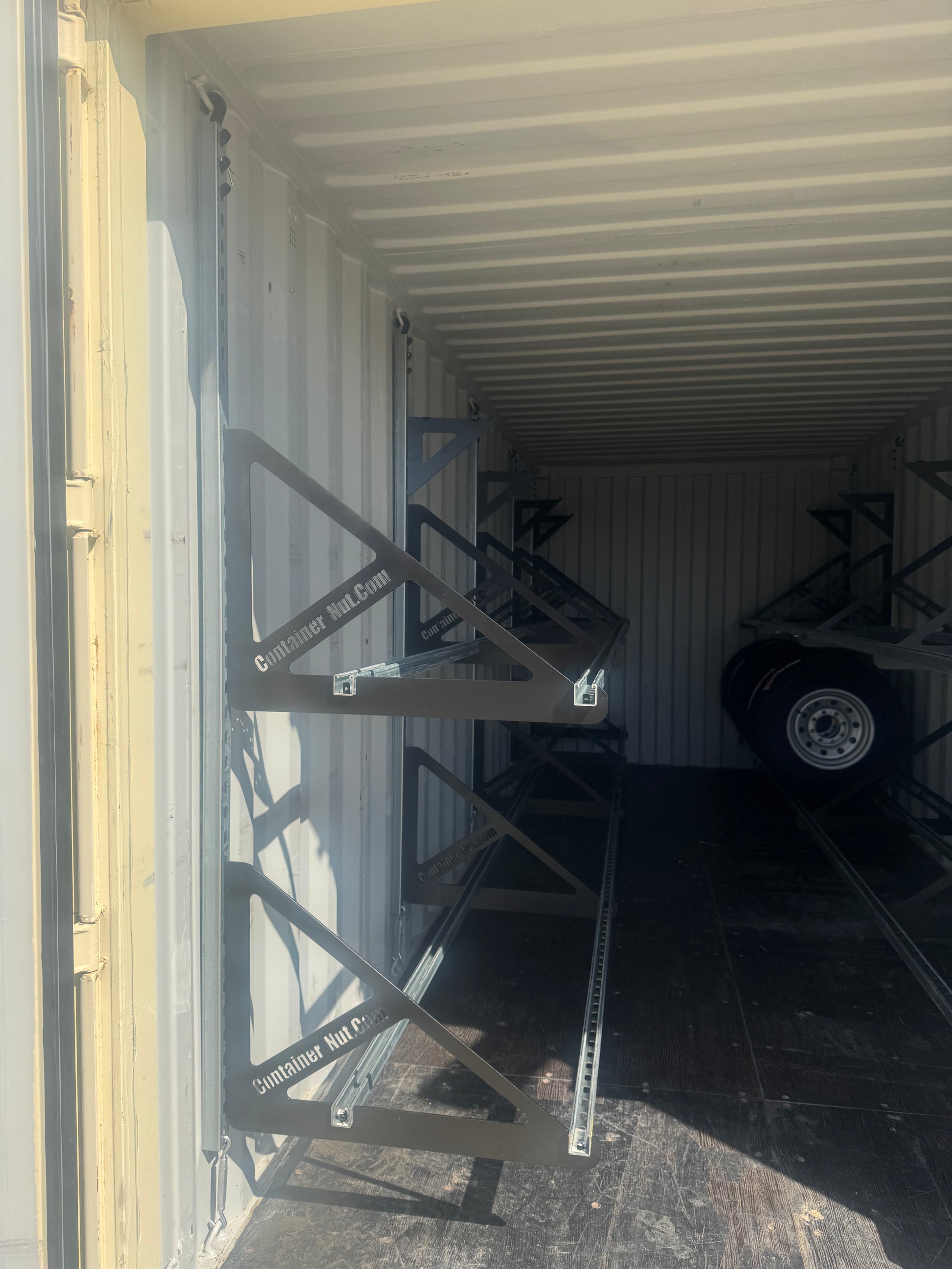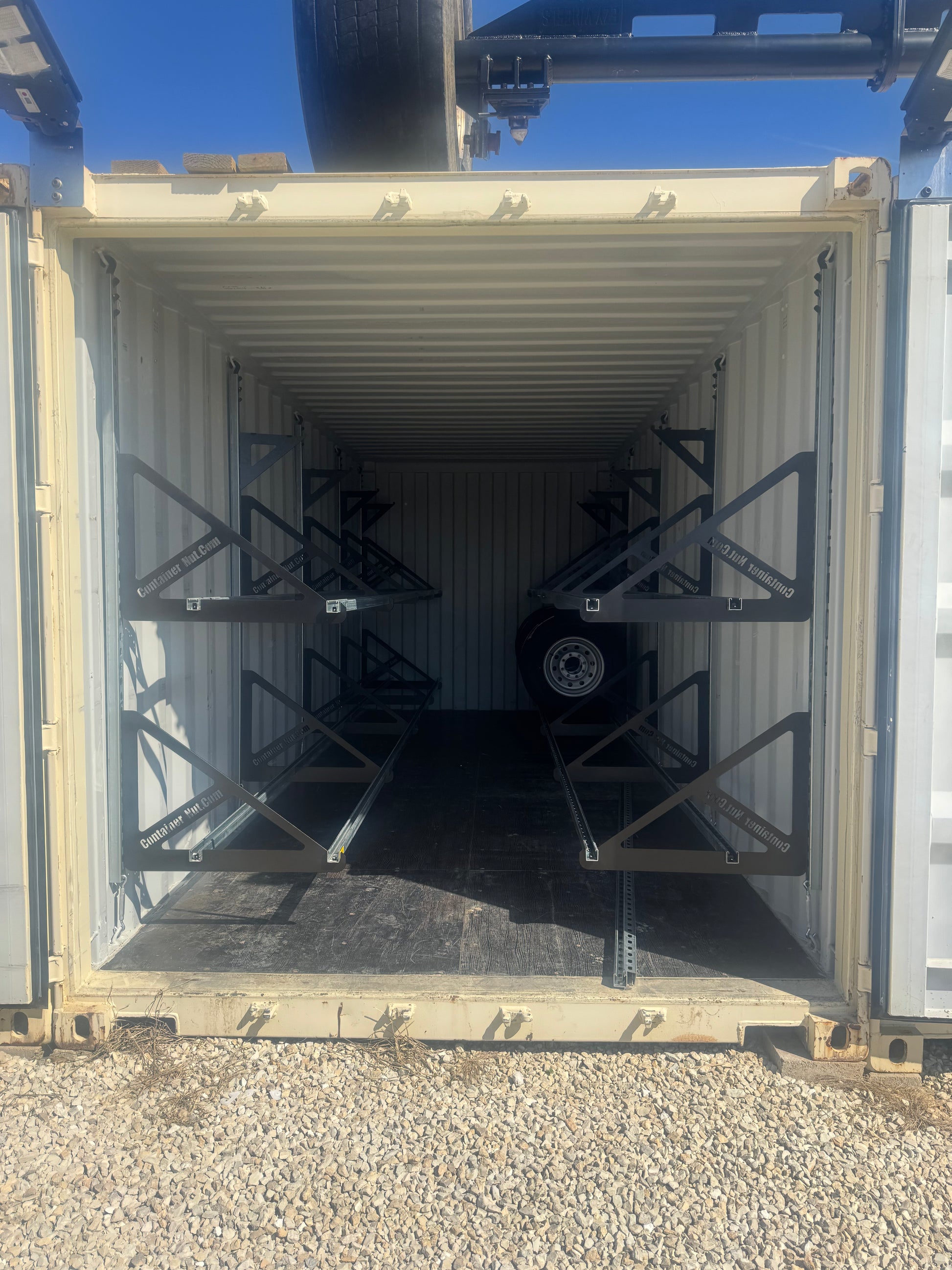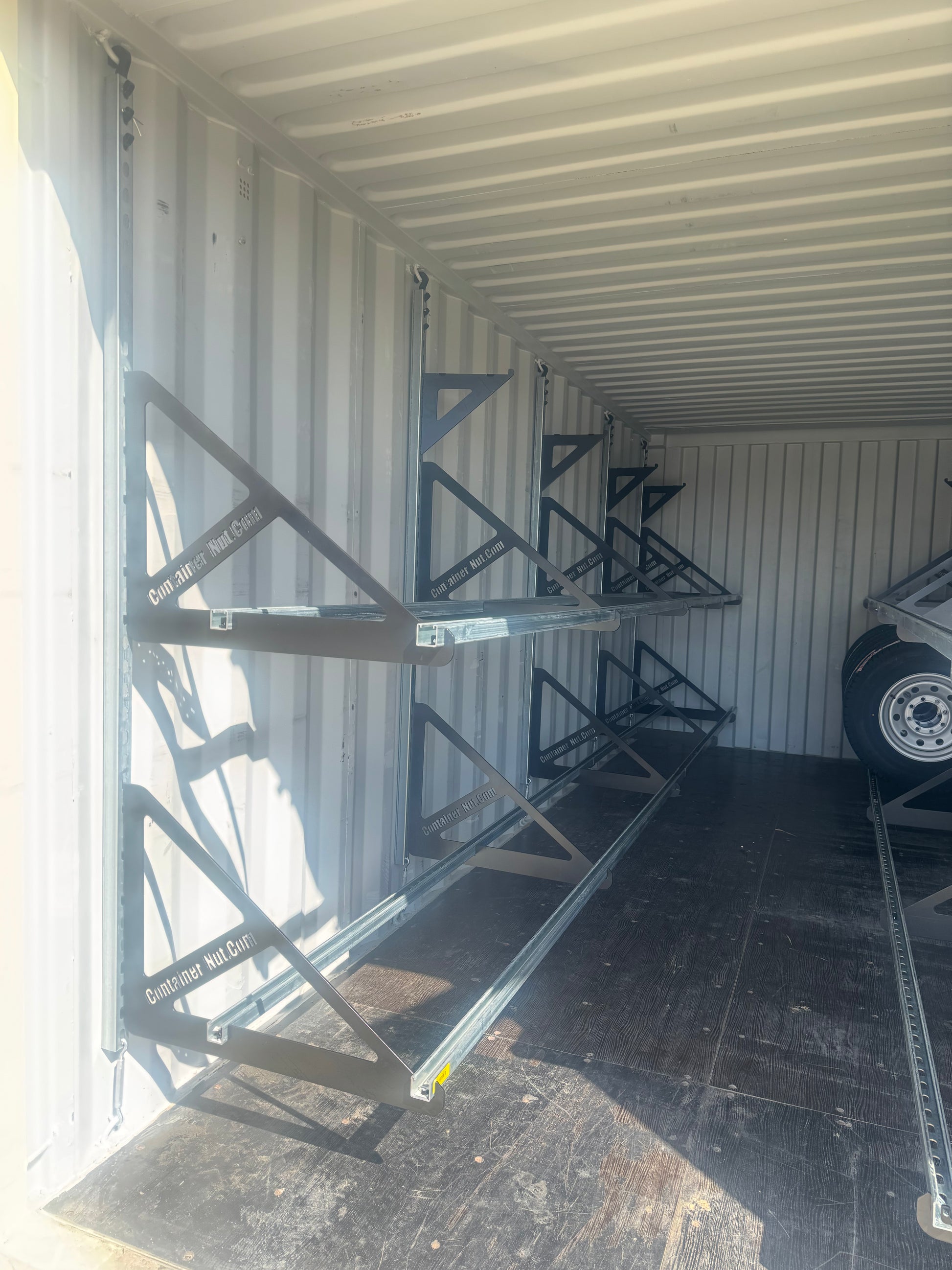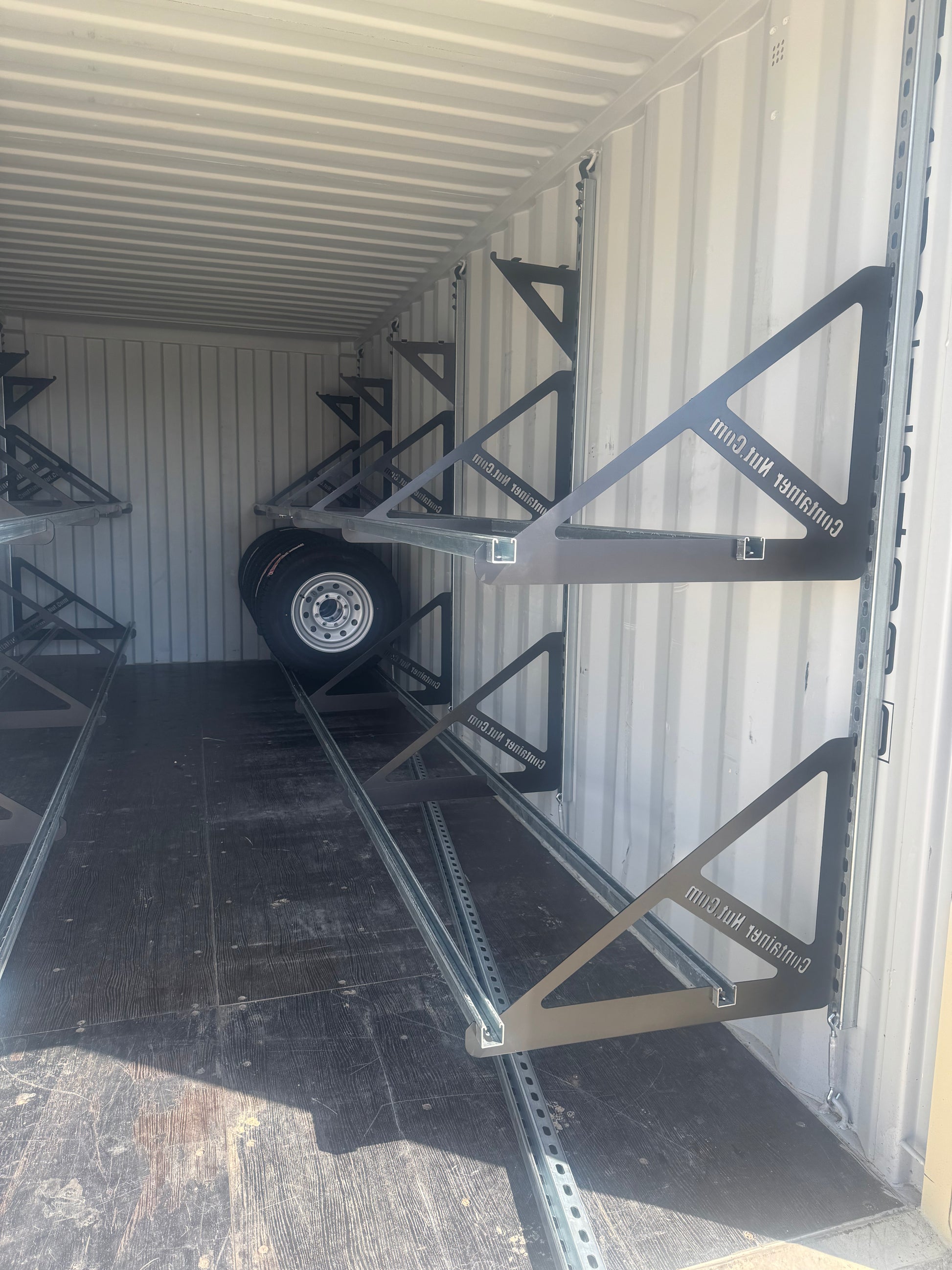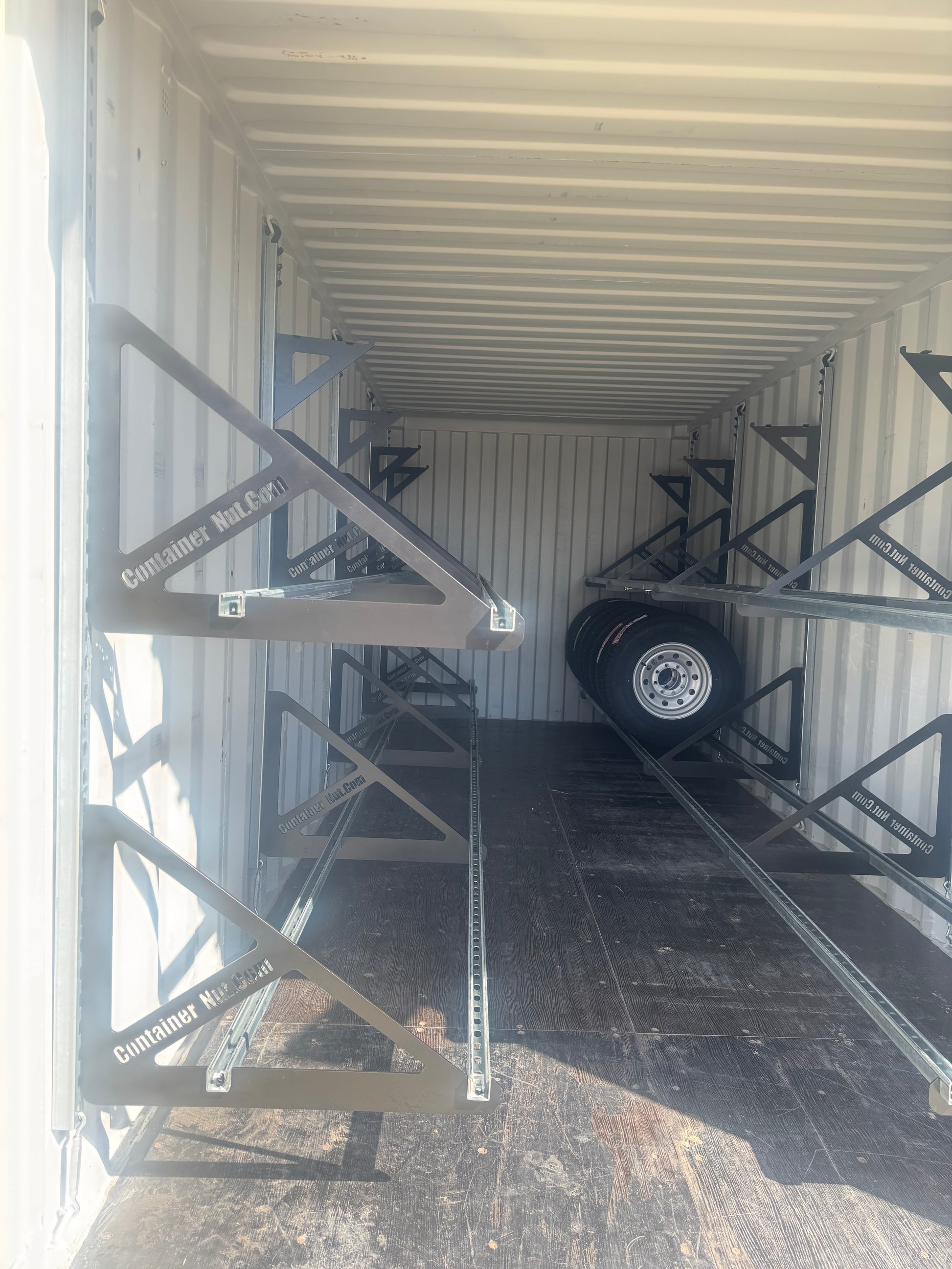 With this system, you can set up an entire 20-foot shipping container in approximately one hour. When installed as shown in the product images, a 20-foot container can securely hold up to 80 tires or more.