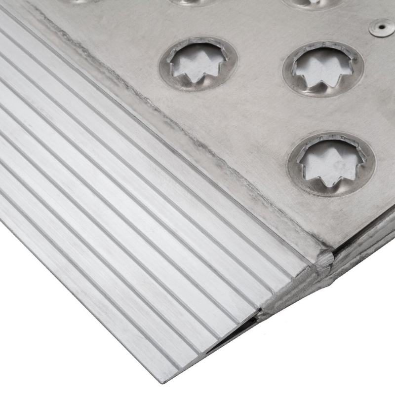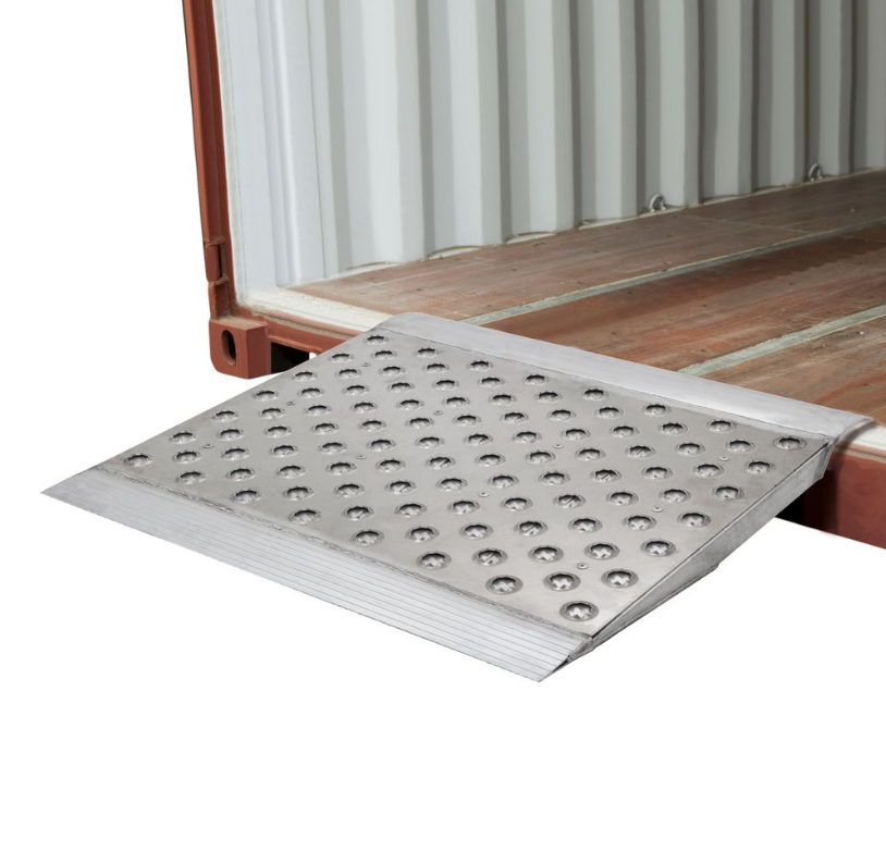 Effortlessly and safely load or unload containers with forklifts or pallet jacks using the HD Ramps Punch Plate Shipping Container Ramp. Crafted from high-strength, lightweight aluminum with a patented extruded truss design, this ramp supports up to 8,000 lbs per axle. The raised punch plate surface ensures reliable traction for both equipment and personnel, even in wet or icy conditions, while the knife foot provides a smooth ground-to-ramp transition, preventing pallets from jolting during use. Designed for container edges from 4.5" to 8" high, this ramp is proudly made in the USA.