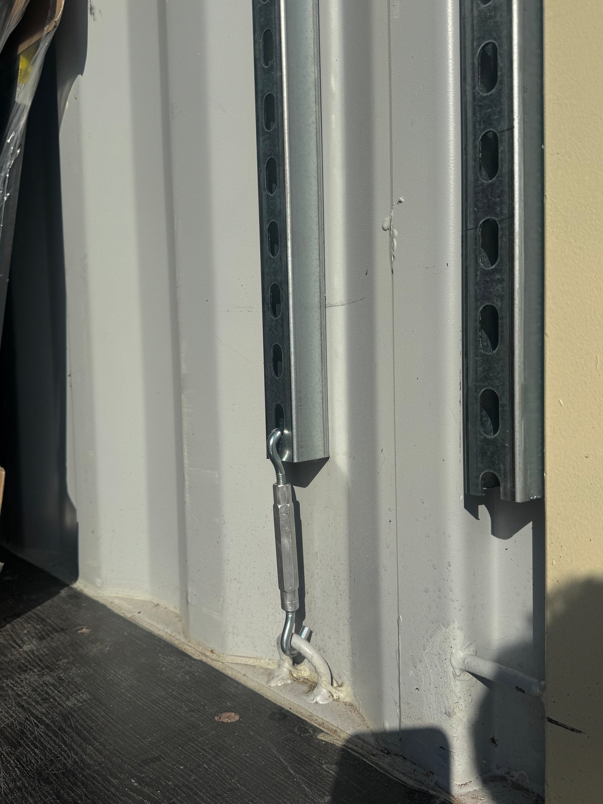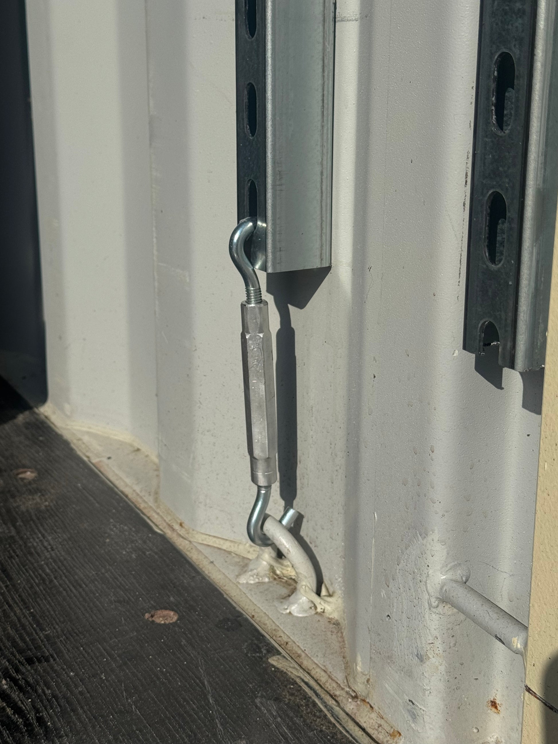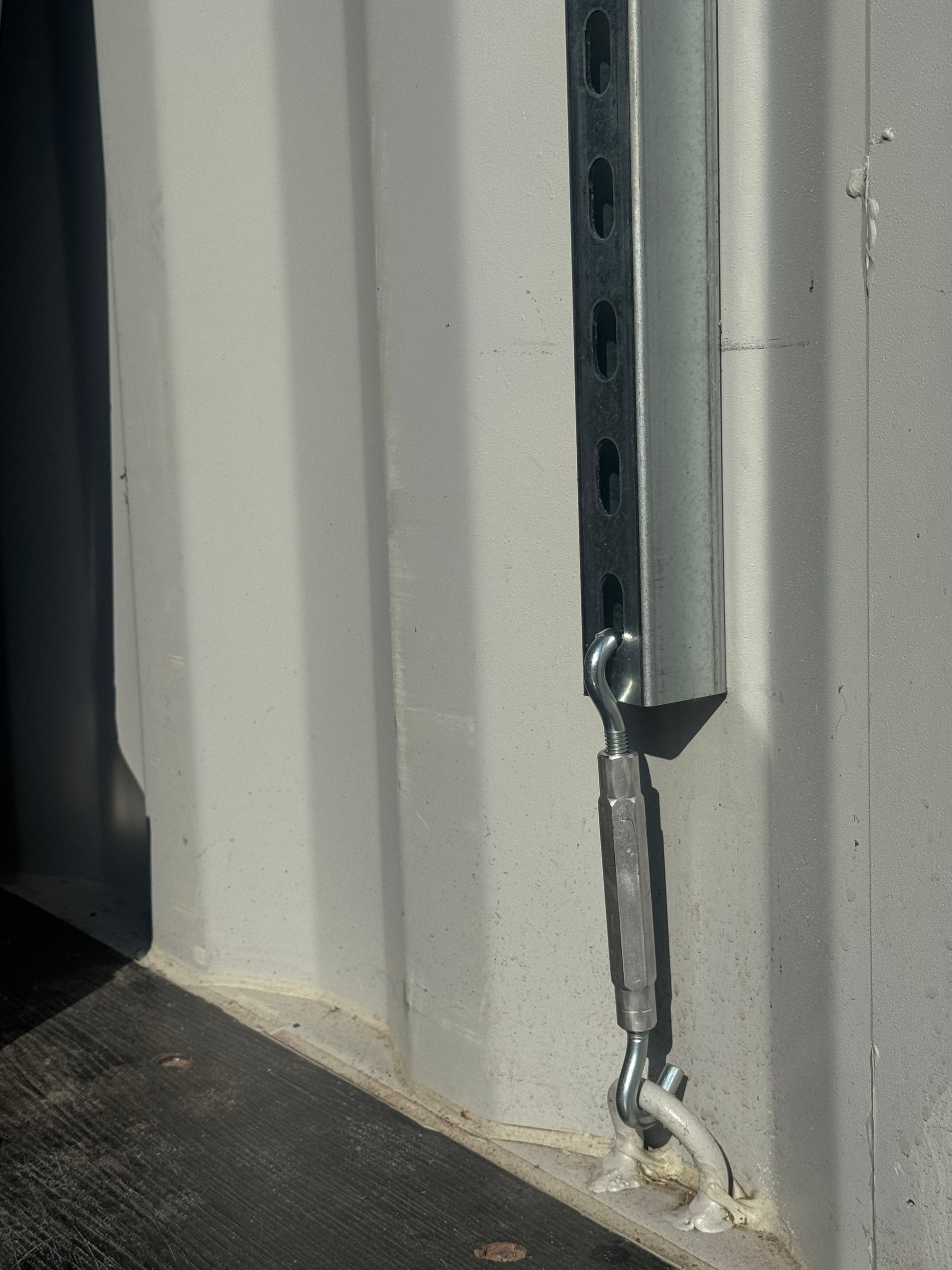 This high-quality turnbuckle is specifically designed to provide additional security for Unistrut installations inside shipping containers. Its user-friendly design allows for quick and efficient installation—simply insert it into the final hole of the Unistrut and attach the hook to the container floor. Once tightened, it ensures a secure and stable hold.